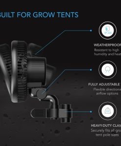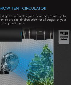 Designed with an EC-motor to provide precise air circulation for all stages of a plant’s growth.,Digital 10 speeds, from gentle breezes for seedlings to a powerful airflow for flowering.,IP-44 rated specifically for the grow environment to be resistant to high humidity and heat.,Connects with smart controllers to access climate triggers, grow cycles, scheduling, and more.,Impeller: 6.5″ , Airflow: Up to 315 CFM , Non-Oscillating Manual Swivel , Fits All Grow Tent Pole Sizes