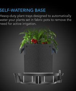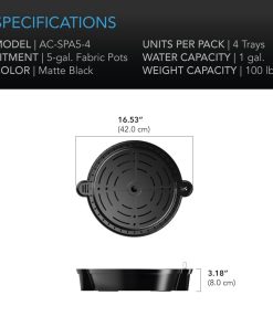 Product Description A set of under-trays designed for use with fabric pots to automatically deliver water to eliminate the need for active irrigation. The self-watering fabric pot base directs water up to your plant using high absorption wick lines that moisten the soil and roots. Its heavy-duty saucer stores runoff water and nutrients and, when used with the reservoir plate, can withstand up to 100 pounds. This plate elevates your fabric pot up the ground to keep a ae and other buildups from spreading. A water gauge is included to display water levels in the reservoir while the strainer spout on the other end enables quick pouring and replenishing. Applications The self-watering base is a companion piece with potted planters made of nonwoven fabric that allow water to permeate and soak through. Each water delivery plant stand in this 4-pack set can support round fabric pots with up to 5-gallon capacities, weighing up to 100 pounds. You can set this anywhere traditional saucer trays and potted planters are found including spaces like: Grow Tents Grow Rooms Greenhouses Front Yards Back Yards Outdoor Gardens