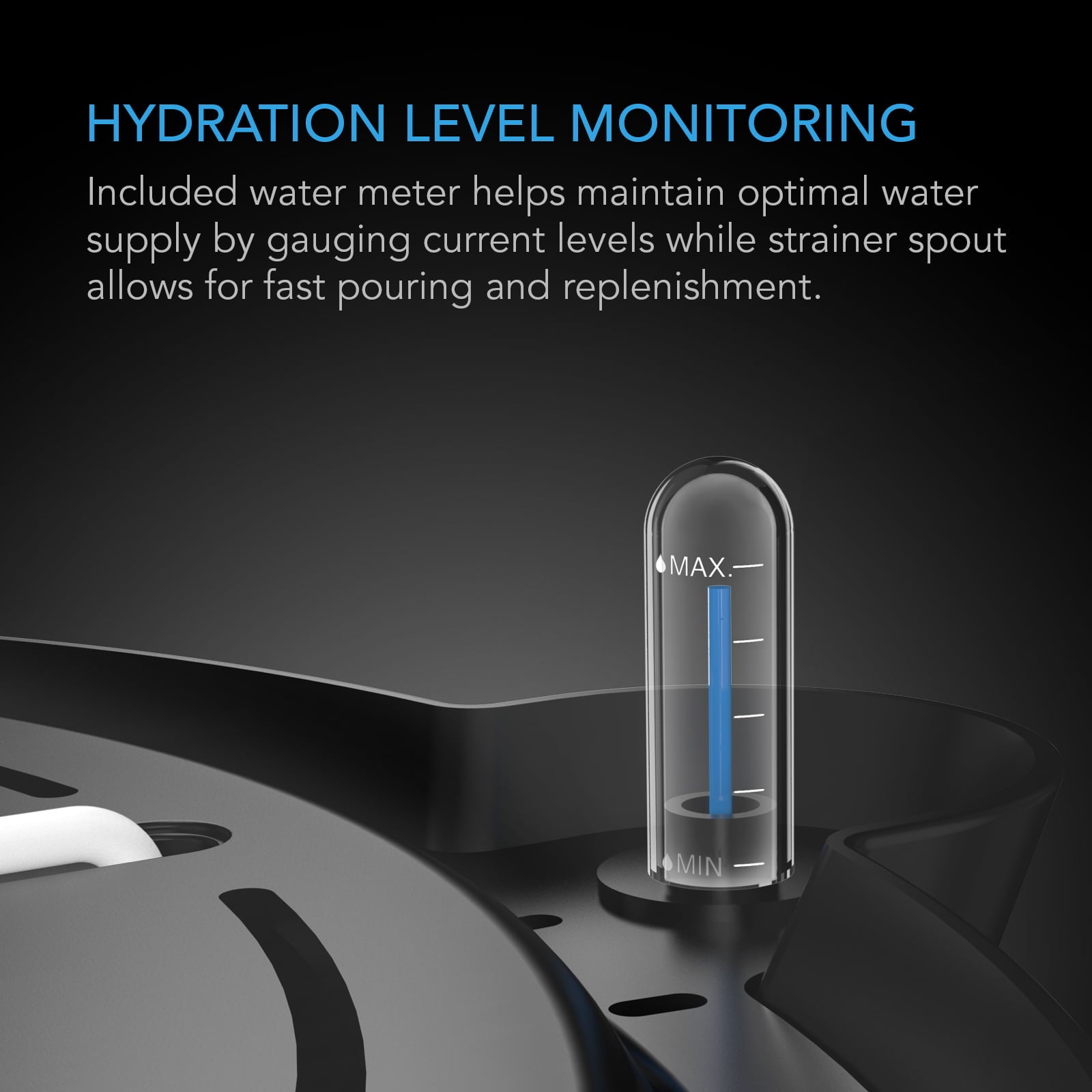 - Included gauge displays the current water level while the strainer spout enables quick replenishment.