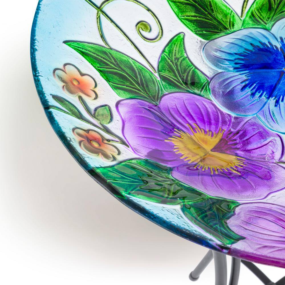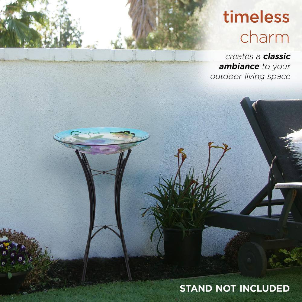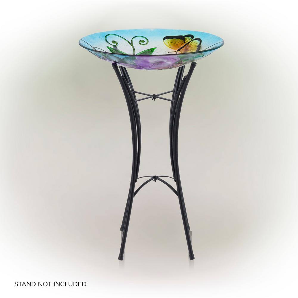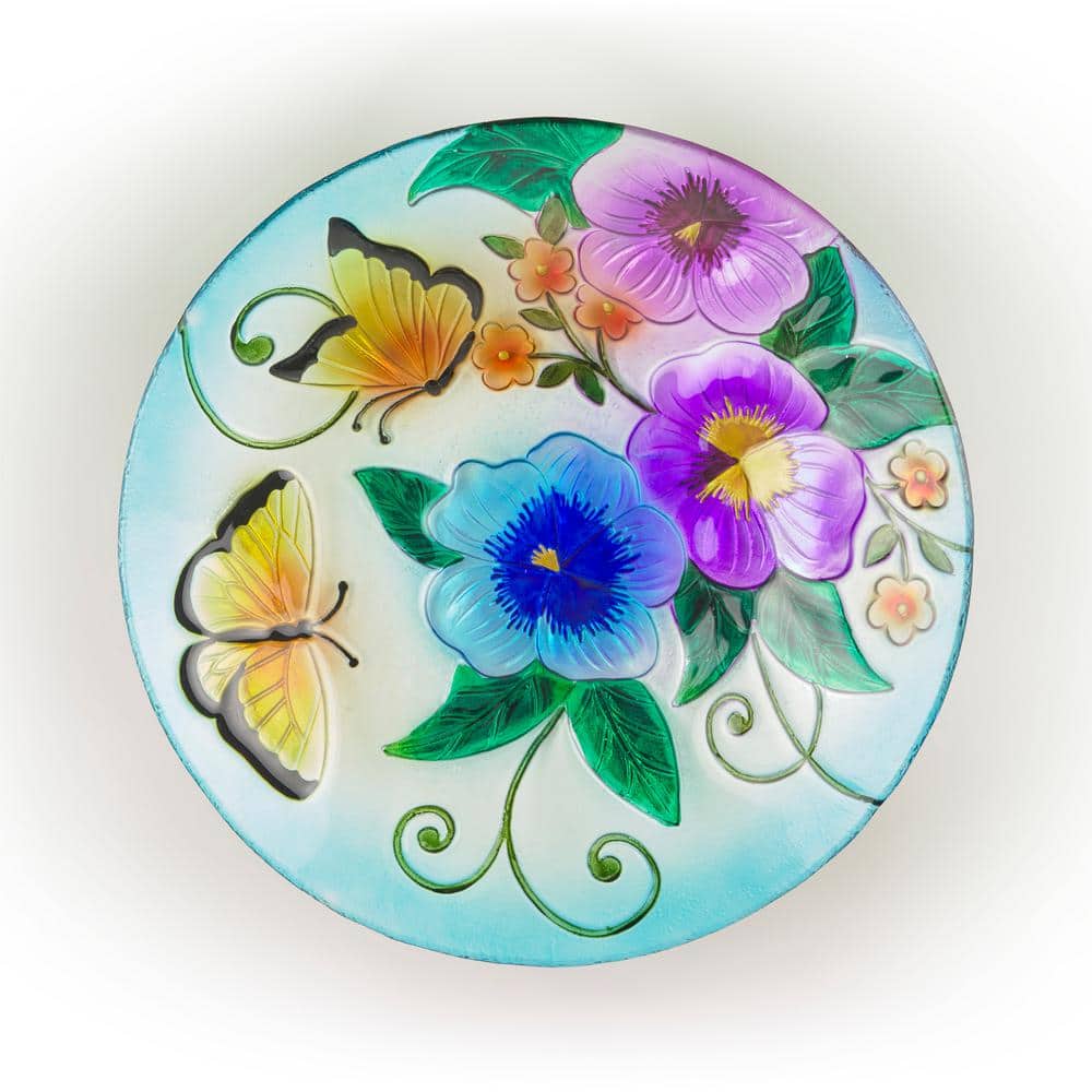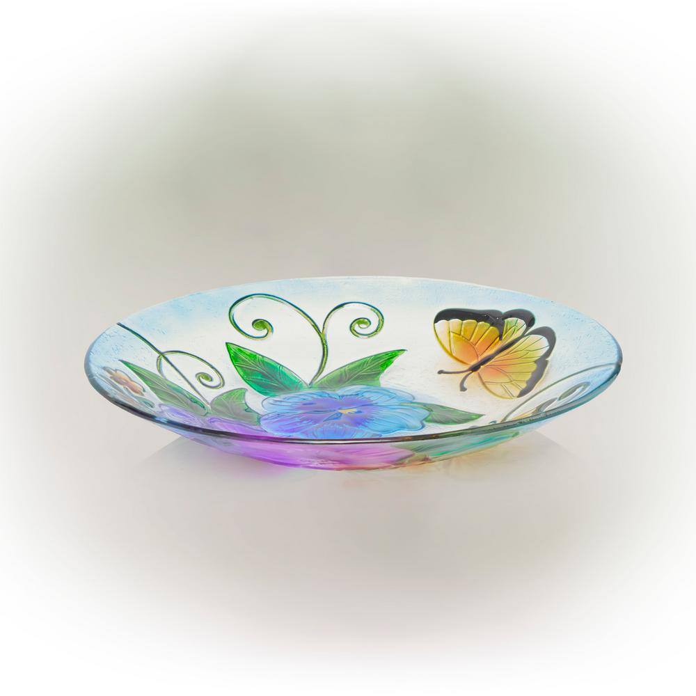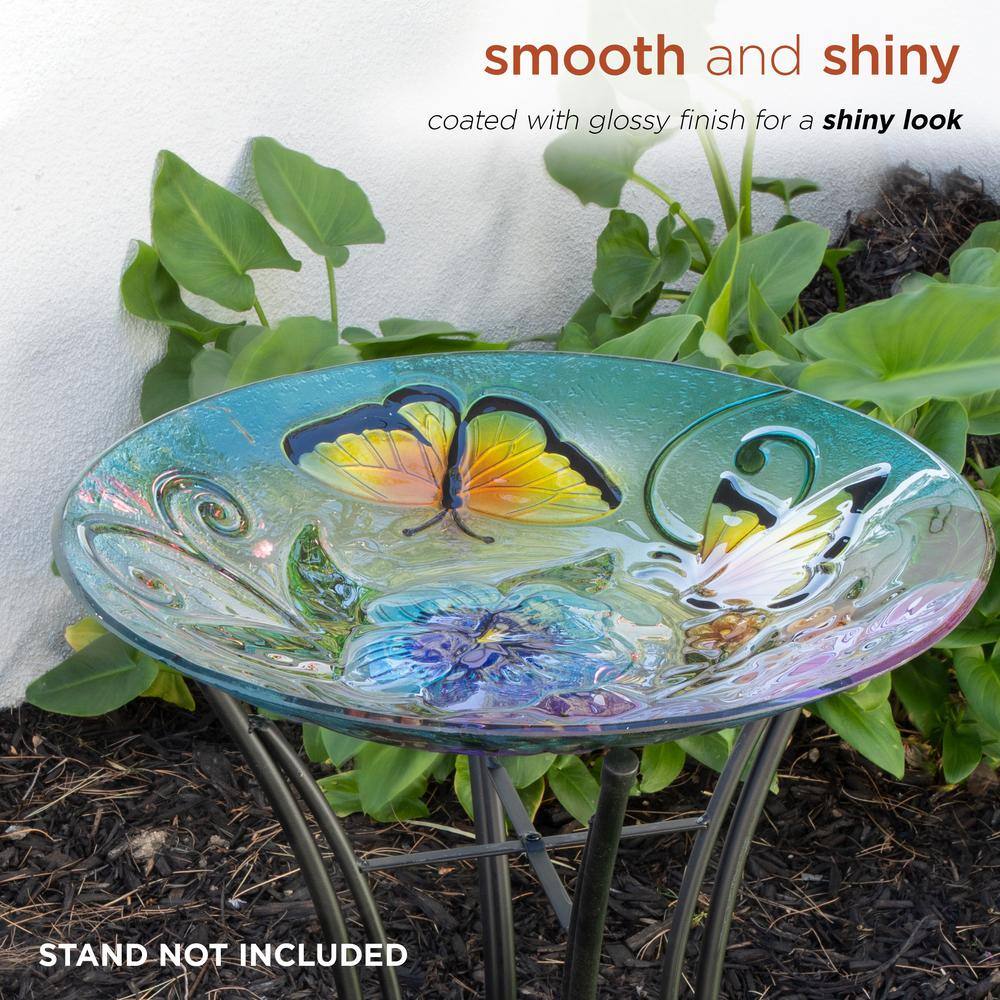 Beautiful artful glass birdbath bowl: watch all birds splash over the hand-painted look of flowers and butterflies. The colorful and vibrant style will add a gorgeous touch your garden or any outdoor living space.