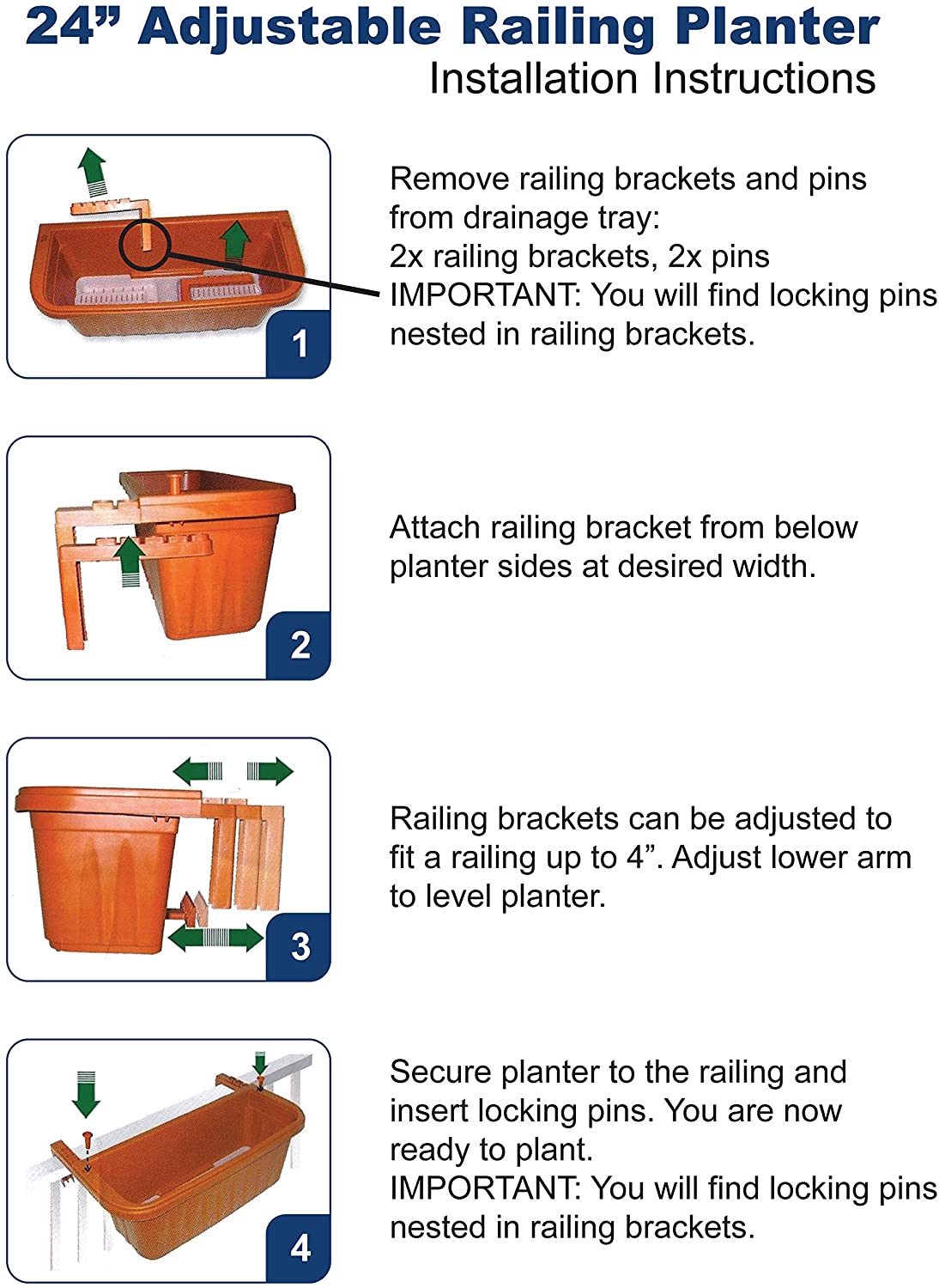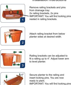 With this Adjustable Railing Planter you can now beautify your decks, fences, railings, and sign post! Lock the support arm to the desired width, hang and you are done! There are no tools, mounting hardware, or drilling required. These are ideal for wood or metal railings. There are also hidden lower brackets to keep the planter level. Any excess water sits in the lower reservoir. Measures 24″L x 7. 5″W x 7. 5″H. IMPORTANT: You will find locking pins nested in railing brackets.