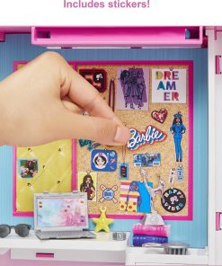 The Barbie Dream Closet inspires kids to create endless looks and stories to go with them! This modern pink closet opens to more than 2 feet wide (60+ cm), has more than 10 storage spaces and features a rotating clothing rack, full-length mirror and desk space. Store and display the more than 30 fashions and accessories using the drawers, shelves and clothing racks. The rotating clothing rack really spins — just turn the knob to turn the rack and select an outfit. Kids can use the doll stand and mirror to style and model their looks; then use the desk space and accessories to play out sharing with friends. Kids can even customize the cork board above the desk with the included sticker sheet! The closet playset comes with five complete outfits, including accessories, for any occasion: two trendy day outfits, an evening look, a pediatrician outfit and a sporty scuba suit with mask and fins. Kids can also use the included sticker sheet to decorate the workspace. When playtime is over, pack up and close the closet to store or take on the go! A sleek carrying handle makes it easy to carry. Includes Dream Closet and more than 30 pieces that include five looks and accessories. Colors and decorations may vary.