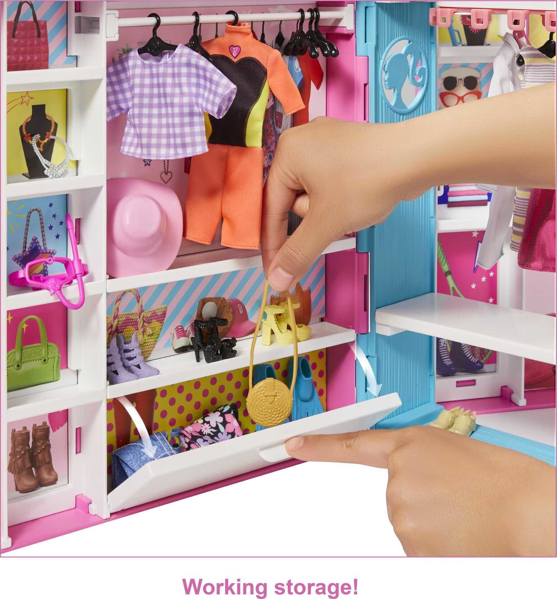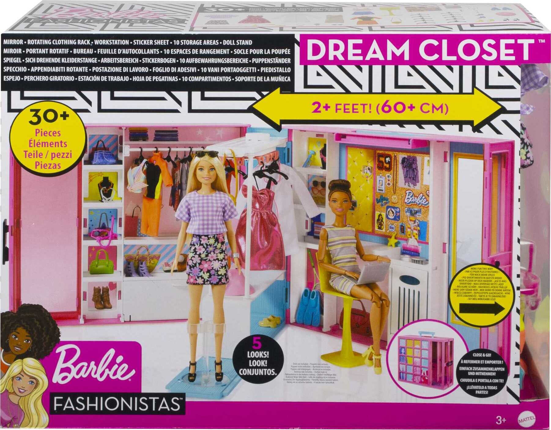 - The Barbie Dream Closet opens to reveal a play space more than 2 feet (60 cm) wide with 10+ storage areas, a rotating clothing rack, full-length mirror, customizable desk space and 30+ fashions and accessories!