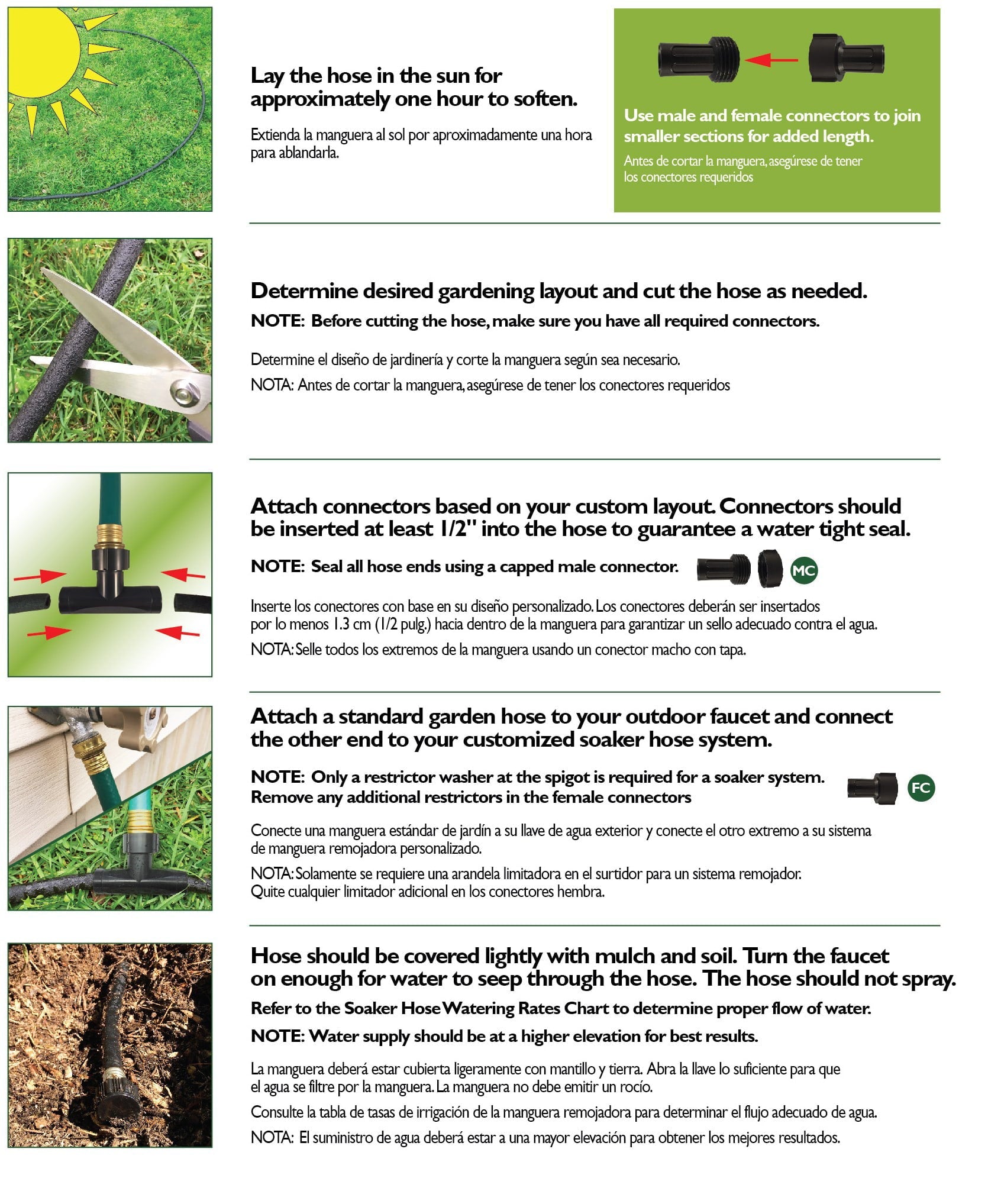 - The soaker kit contains a 100-Foot soaker hose and a 20-piece connector, along with detailed instructions for watering and hose setup.