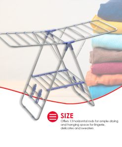 AMPLE DRYING SPACE ANYWHERE: Place it on the deck or in the laundry on a rainy day. Offers 13 horizontal rods for ample drying and hanging space for lingerie, delicates and sweaters with a bottom tier for additional hanging and storage space for shoes, slippers, and laundry accessories.
