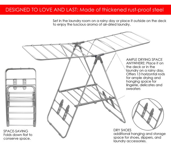 AMPLE DRYING SPACE ANYWHERE: Place it on the deck or in the laundry on a rainy day. Offers 13 horizontal rods for ample drying and hanging space for lingerie, delicates and sweaters with a bottom tier for additional hanging and storage space for shoes, slippers, and laundry accessories.