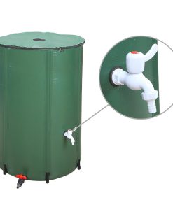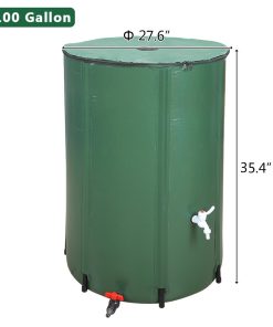 Capacity available in 100 Gallon. Simply place it under a downspout and let water run through the mesh top. Outflow valve included for water outflowing or connecting to another VINGLI rain barrel. -