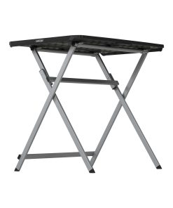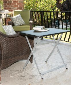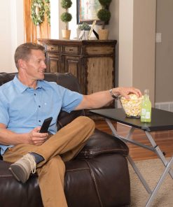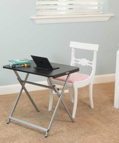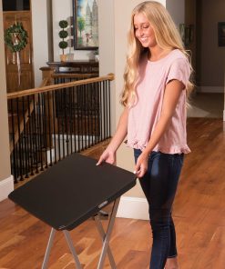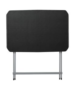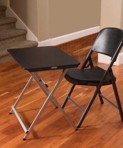 30-Inch Personal Tray Table – This is a black and silver personal folding table 30 in. X 20 in. with the X-frame and a rectangle top. Lifetime 30-Inch Personal Tables are constructed of high-density polyethylene and designed for strength and stability. The wide-leg stance and brace position make the table the perfect desk height. The steel frame design folds flat for easy storage and is protected with a powder-coated, weather-resistant finish. The modern style features thin edges, rectangular tubing, and a wide foot stance for ample legroom. The tables are built for indoor or outdoor use.