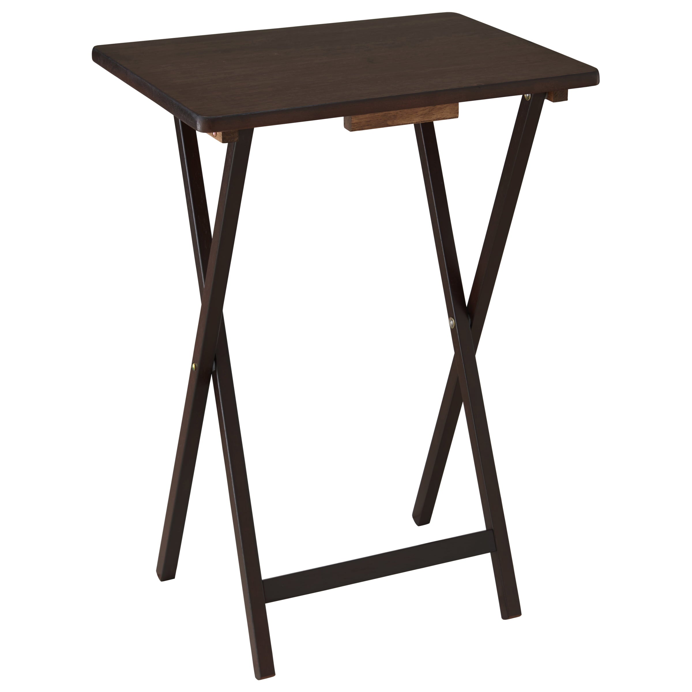 Mainstays 5-Piece Walnut Folding Tray Table offers a quick and stylish side table wherever extra table space is needed, while thoughtfully designed to effortlessly fold away conveniently when not in use. It easily folds flat and can be stored on an ultra-handy storage tray conveniently when not in use. Constructed from solid rubberwood and boast a classic natural finish sure to complement any decor scheme and color story. This table not only provides ample room to keep things within reach but also works perfectly as a quick pop-up table to serve extra drinks and snacks. It is also the perfect addition to dorm rooms or smaller living spaces. Use Mainstay Tray Table to instantly create a desk, small kitchen table and work surface, meals by the television. Its sleek design can also fit in with many styles of decor, a perfect choice for every home.