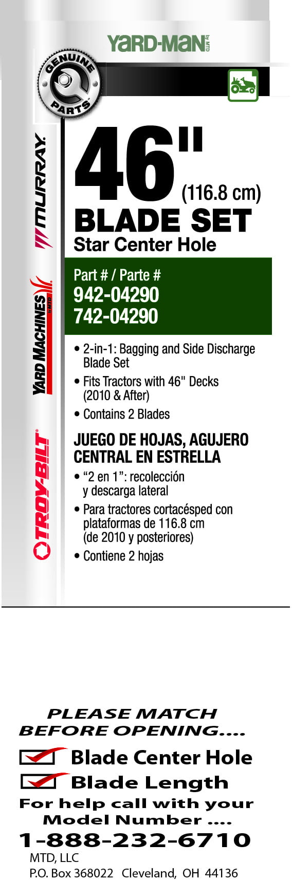 This is a two-blade set of item 942-04290. These are 2-n-1 blades which means they bag and side discharge grass clippings. Created to specifically fit 46-inch mowers designed by multiple brands. These brands include MTD, Troy-Bilt, Yard-Man, Yard Machines, Huskee and Bolens mowers. To verify the fit for your mower, please reference your owners manual.
