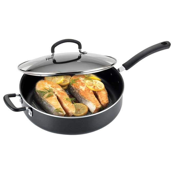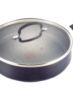 T-fal 5.5-quart Jumbo Cooker with Lid-The Titanium nonstick cooking surface is metal utensil safe and made for years of excellent performance. The unique Thermo-Spot heat indicator assures that the pan is properly preheated to seal in the flavor of foods. The base provides even heating for reliable cooking results every time.