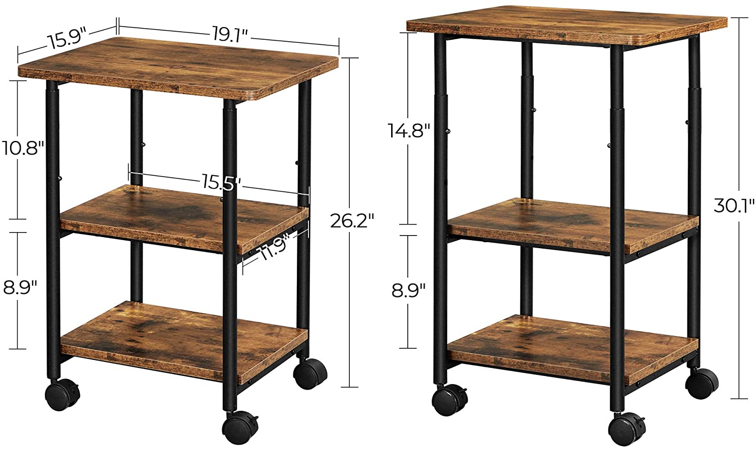 - Flexibility Stands Out: With the adjustable table top, you get a flexible space with a lower height at 26.6” or a higher height at 30.1”. All you need to do is set it at your favorite height and invite printers, paper reams, and other office supplies in