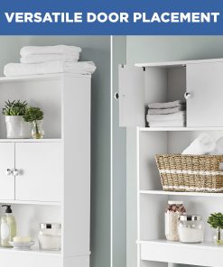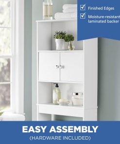 The Mainstays Bathroom Space Saver creates valuable storage inside any bathroom. This bathroom storage unit features three shelves (two open and one concealed) for storing bath essentials, linens and accessories. It is optimized to fit over most standard-height toilets (32.7 in clearance from ground). Additional features include finished edges and a moisture-resistant laminated backer. The unit’s doors can be installed in the middle or top shelf to create a customized concealed storage area. Assembly is easy. Illustrated instructions and necessary hardware are included.
