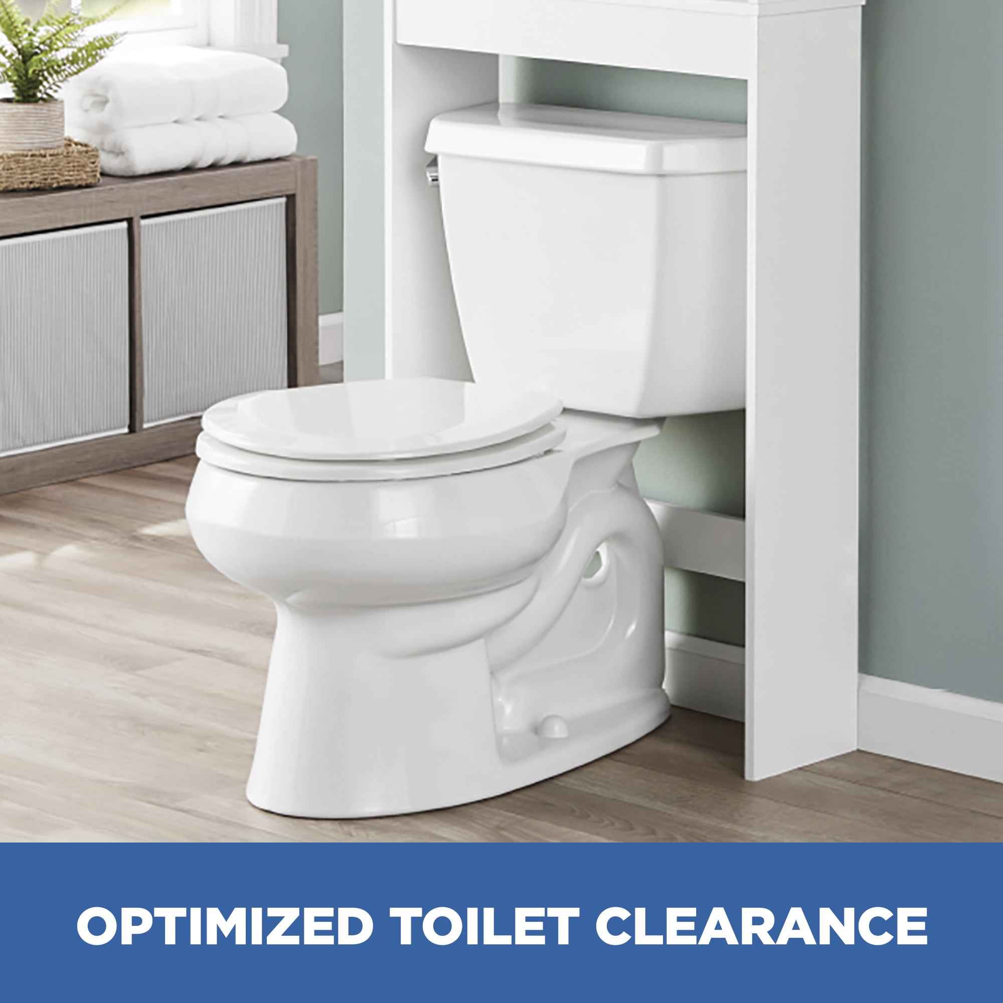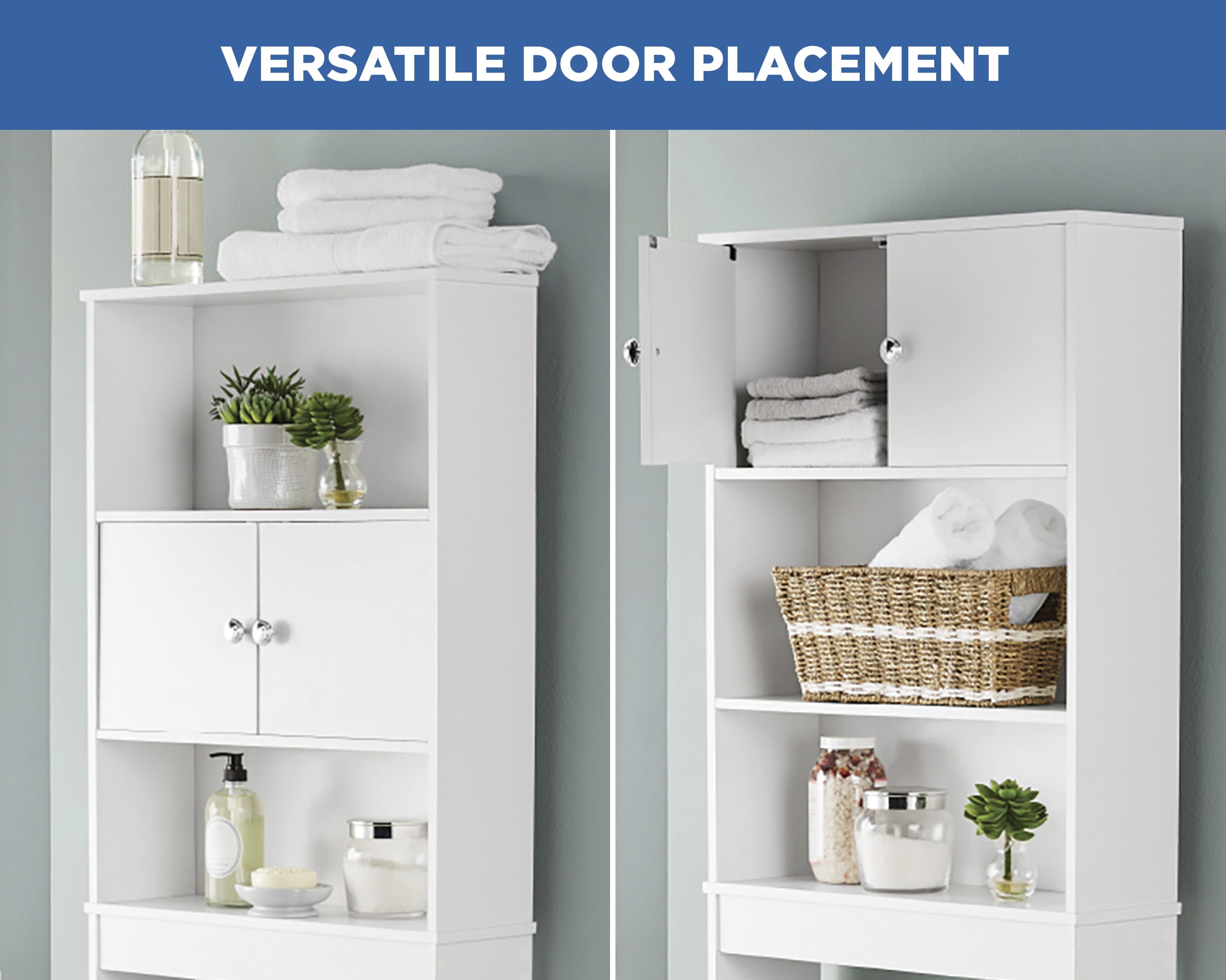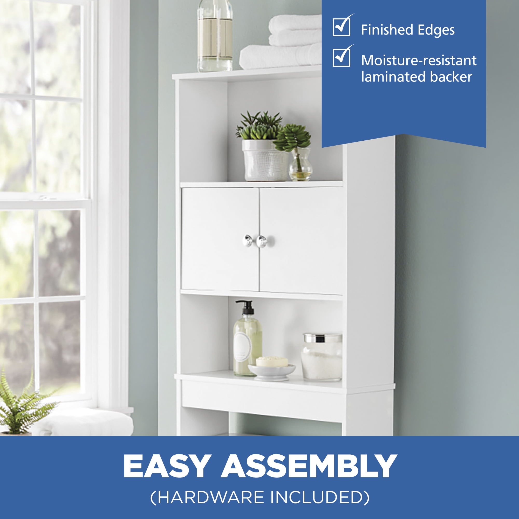 The Mainstays Bathroom Space Saver creates valuable storage inside any bathroom. This bathroom storage unit features three shelves (two open and one concealed) for storing bath essentials, linens and accessories. It is optimized to fit over most standard-height toilets (32.7 in clearance from ground). Additional features include finished edges and a moisture-resistant laminated backer. The unit’s doors can be installed in the middle or top shelf to create a customized concealed storage area. Assembly is easy. Illustrated instructions and necessary hardware are included.