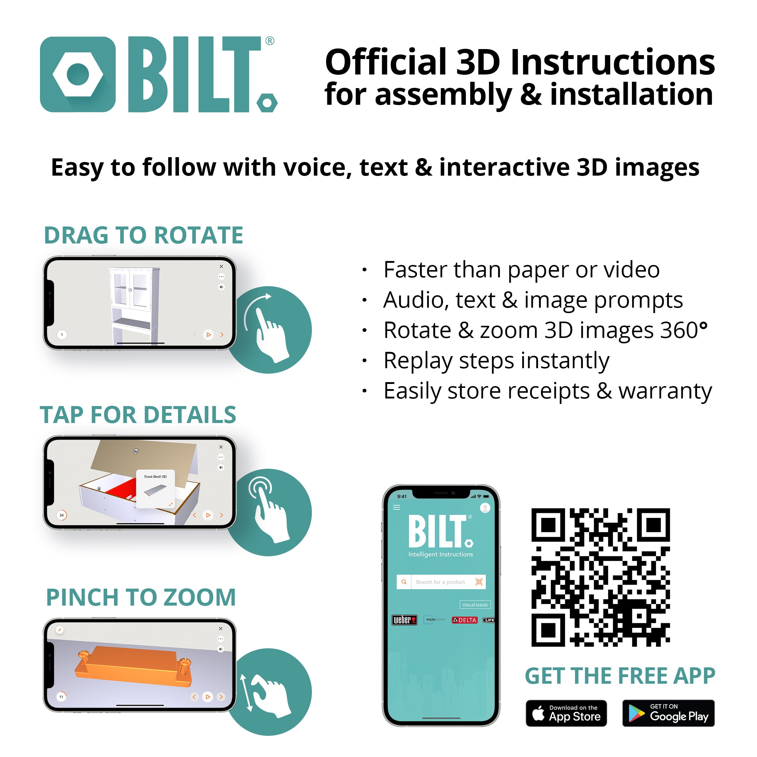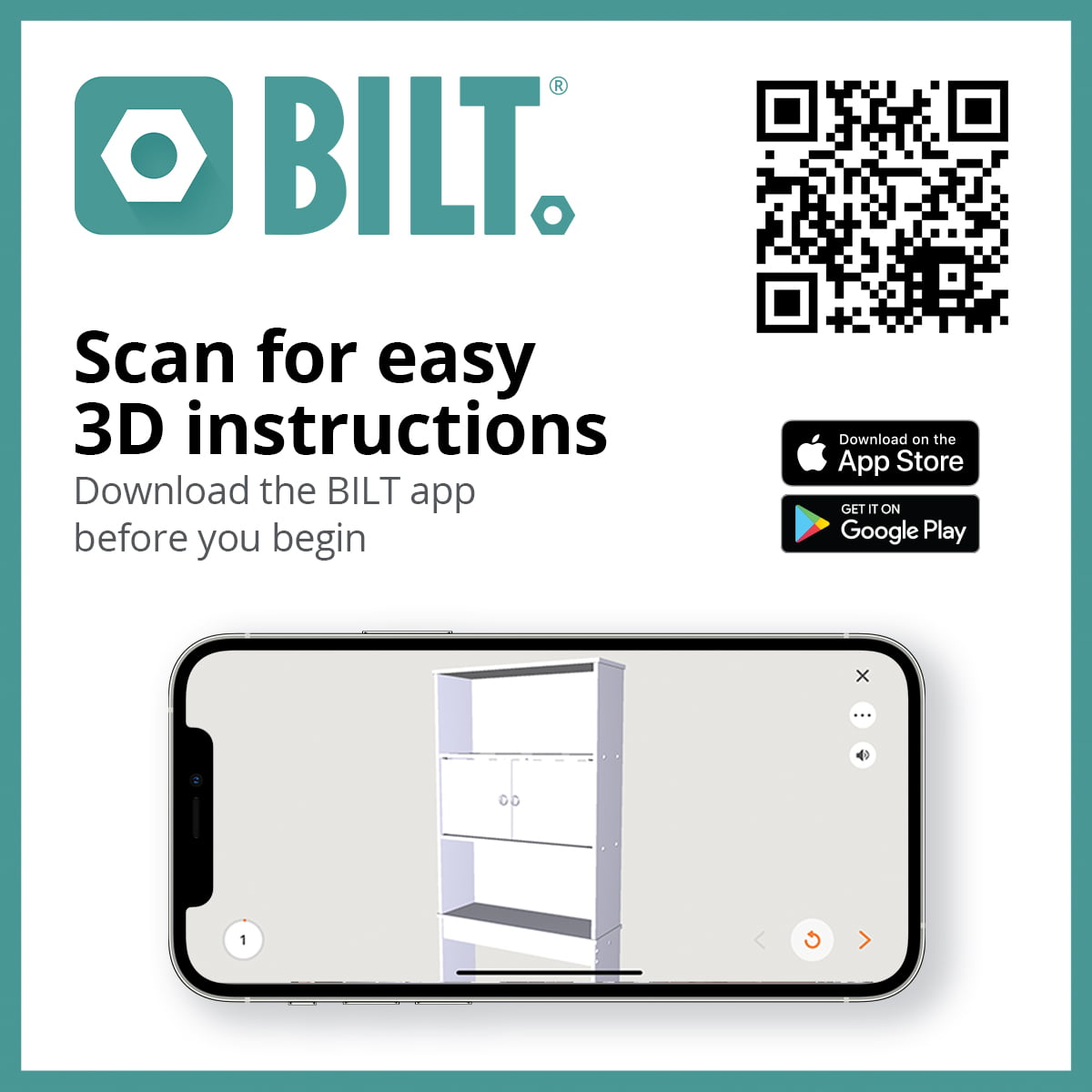 - BILT 3D interactive instructions help you assemble this quickly, efficiently and with confidence that you did it right; download the free BILT app on any mobile device; scan the QR code above to start, and/or view the BILT video to learn more